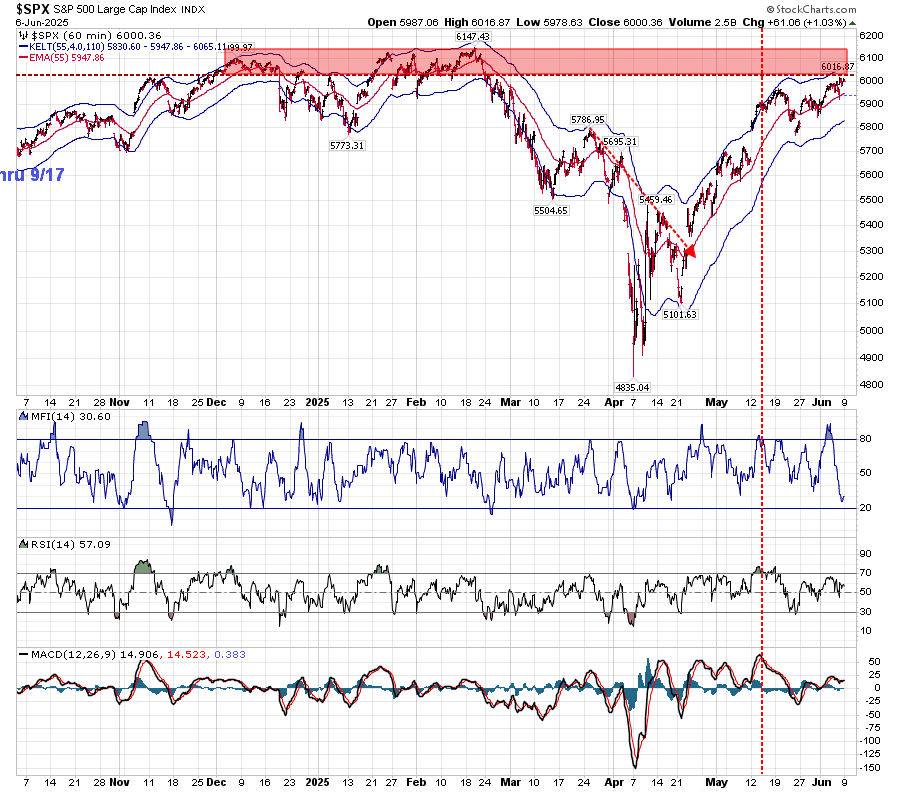 While I still expect Price to climb through June 24, the bulk of this move is hitting what I consider a strong range of Price resistance. Friday’s high was just a point or two away from the lower part of a resistance zone I’ve been suggesting since January: