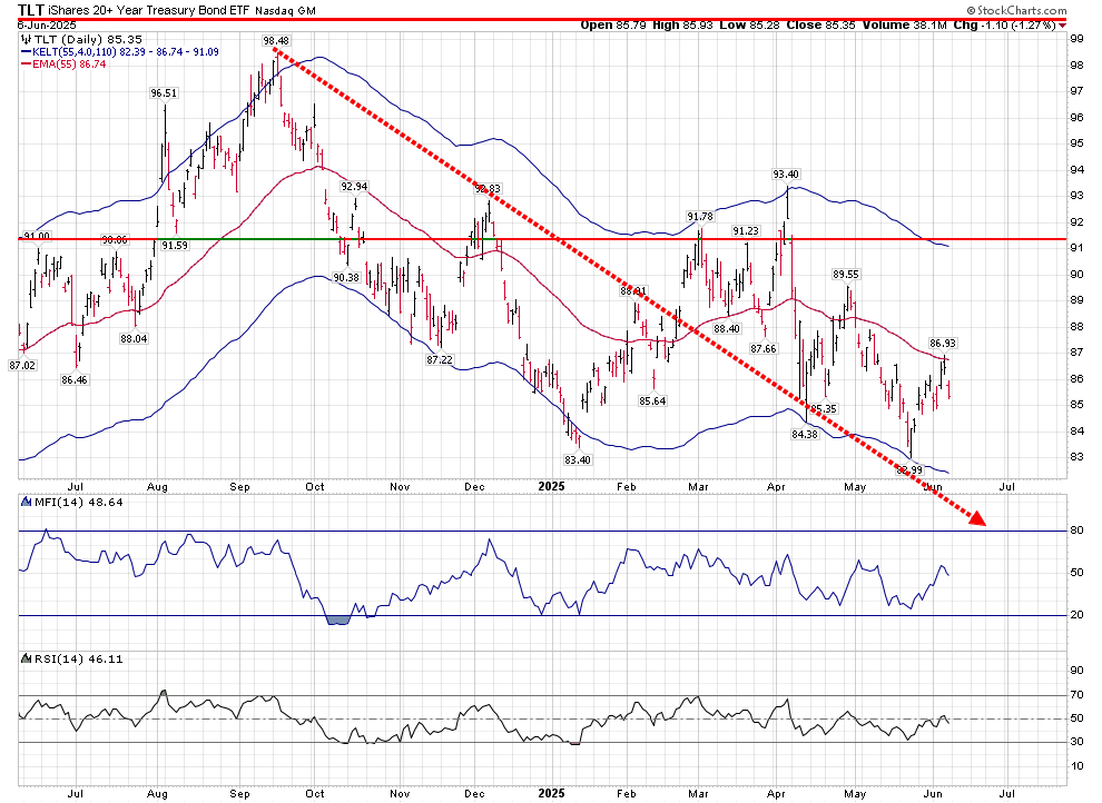 Counter to my thoughts on long term rates, TLT has advanced lately, but was stopped at the middle daily Keltner band: