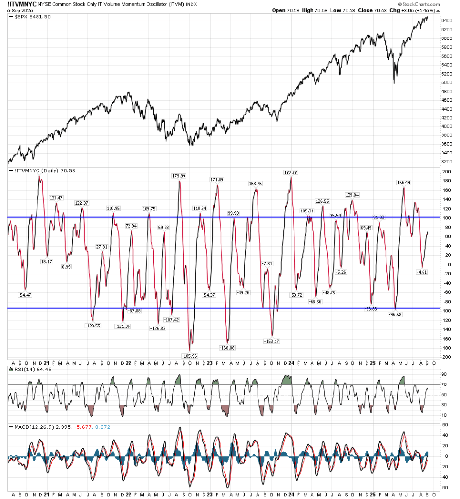 As this is an intermediate time frame chart, combine the view of the indicator with the RSI and MACD status. When an RSI below 30 regains and bounces above 30 at an !ITVMNYC low, it represents a fairly low risk environment. The fact that it bottomed recently at the zero line indicates a market that is still not showing substantial weakness.