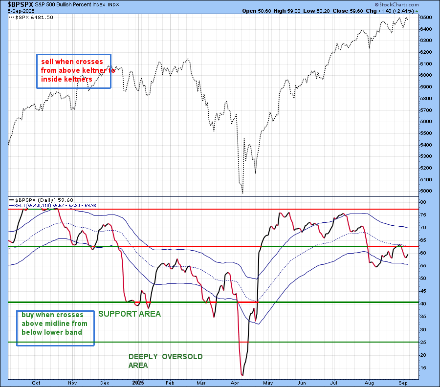 My personal indicators are showing a lack of enthusiasm for this recent move higher. The BPSPX has failed to cross back above the middle of the Keltner Bands. While this is an indication of the weakness of the present trend, the fact that it is still above 50 signals a bullish environment.