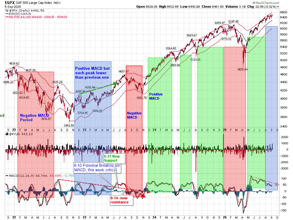 The Daily Companion chart confirms that so far we have been in a Bull phase. The chart does not use the Keltner Bands used by Terry Laundry, but ones that represent the present Optimum Moving Average (OMA) of 35 rather than 55. This shows that support has consistently held even when we corrected since the April lows, just as resistance held until those April lows.