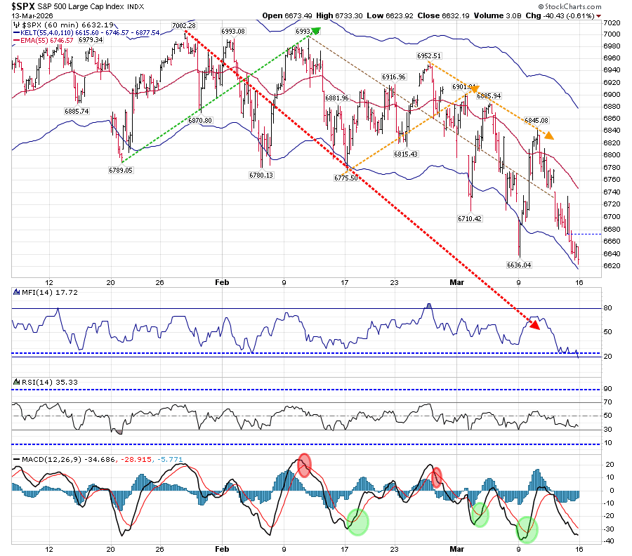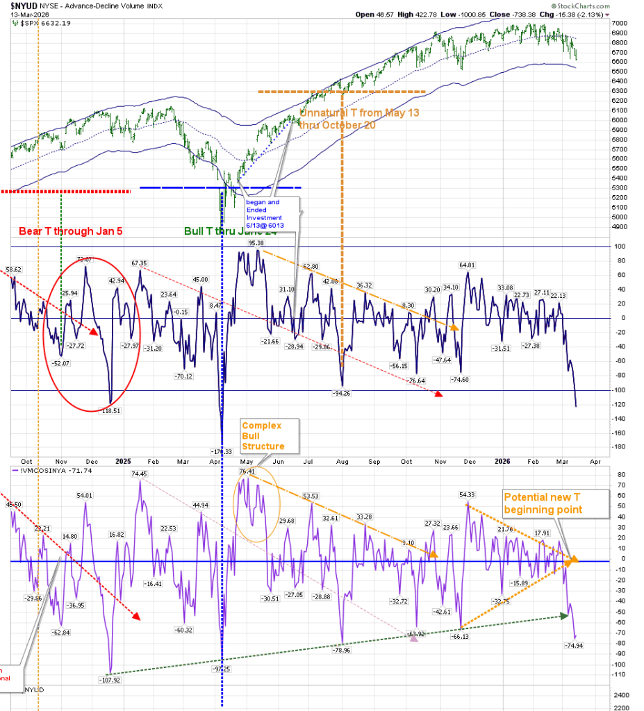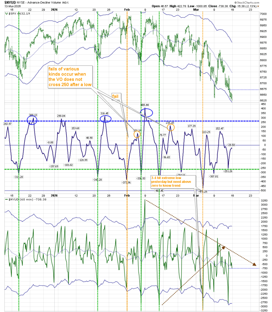 I have had to revise the placement of the upper brown dashed line on the hourly Volume Oscillator chart. The resistance level has been moved up, which means the timing of resolution here has extended to the last week of March. At the same time, it broke through the support of the lower brown dashed line. It is another thing giving pause to making that “short boat trip in a flimsy craft.”