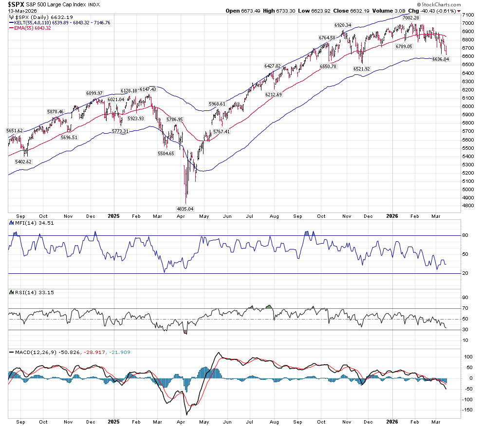 The unmarked version of the SPX Companion Chart shows us to be approaching major support at 6540. RSI has room to go a bit lower, should Price decide to move to that major support. MACD has not reached the extreme levels we saw at the significant bottom of last April, and it may not make it down that low before it reverses. But it isn’t giving an inkling of turning up at this point.