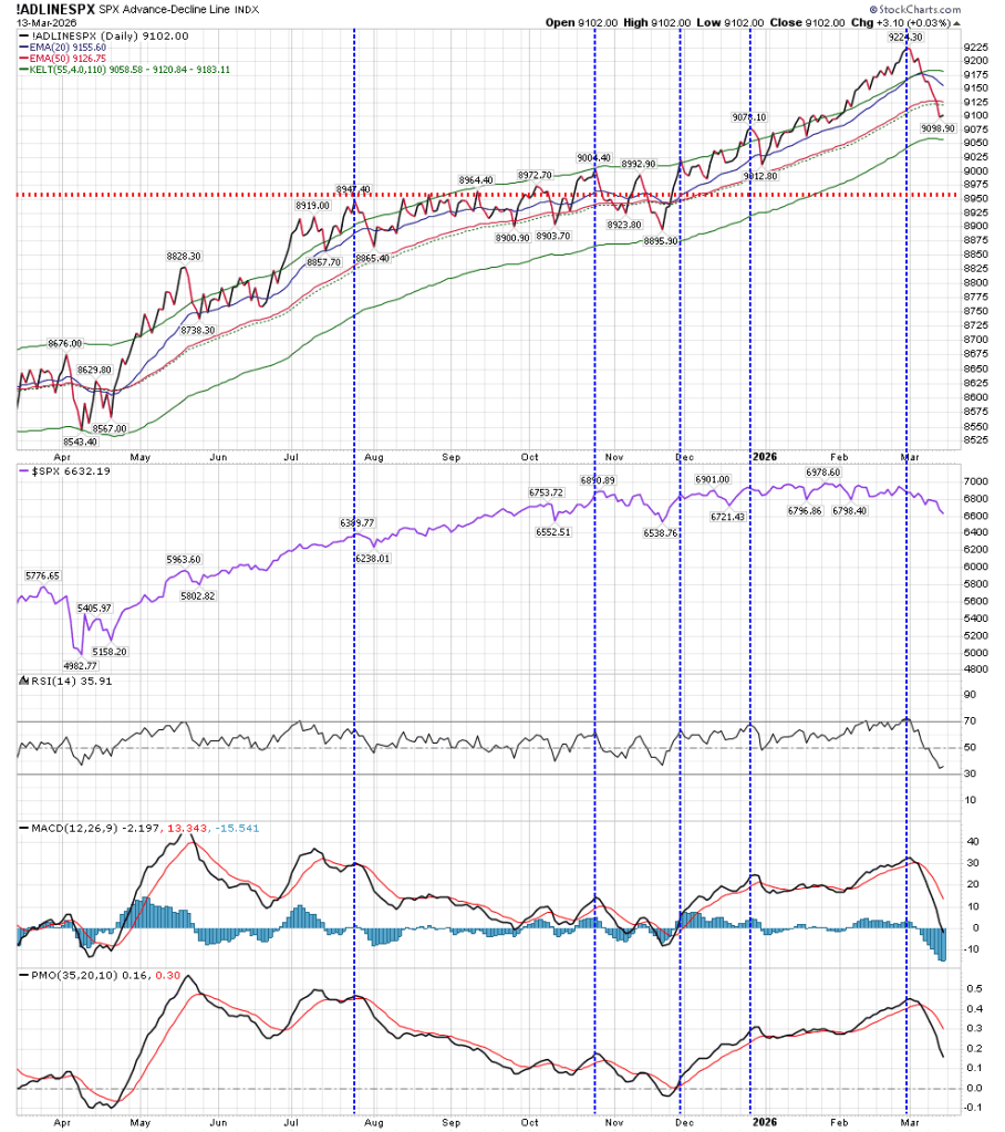 I am also watching the Advance/Decline line. We’ve barreled through support of the 20 and 50 EMA, and are heading to the lower end of support. It should be noted that this lower Keltner band line of support held during last April’s SPX low in Price. The red dashed line represents old resistance, which I now consider to be support.