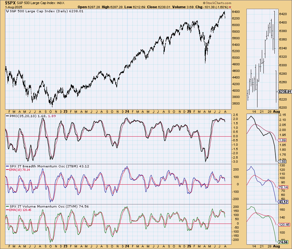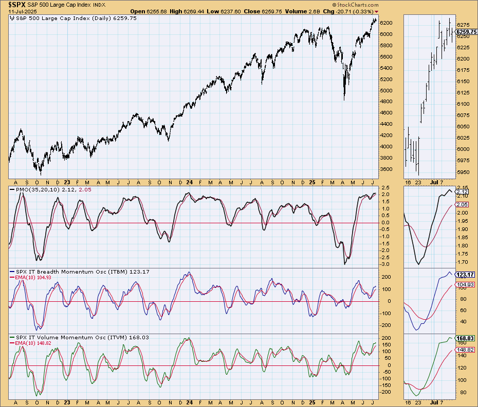The Simple Chart is still showing negative Breadth Momentum, but the Volume Momentum has turned up from neutral support. PMO is faltering: