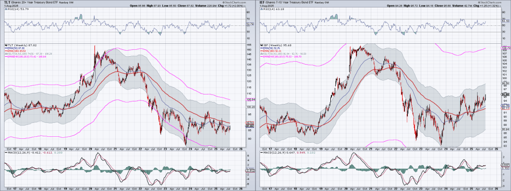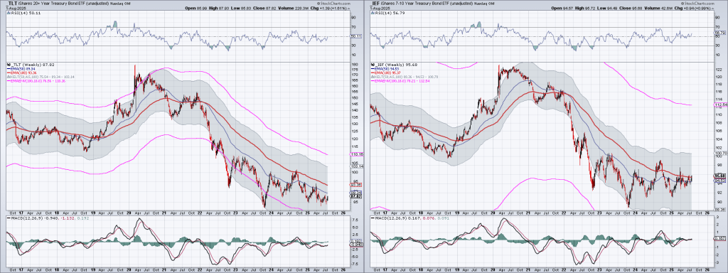 Here are the weekly charts of TLT and IEF using the Optimum Moving Average created by Terry Laundry: