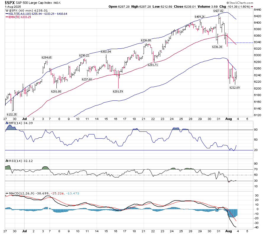 On Thursday, I noted the key reversal that occurred. Immediate resistance is 6255. I would like to see at least 2 bars above that (the lower Keltner band) before I would expect a bounce to hold.