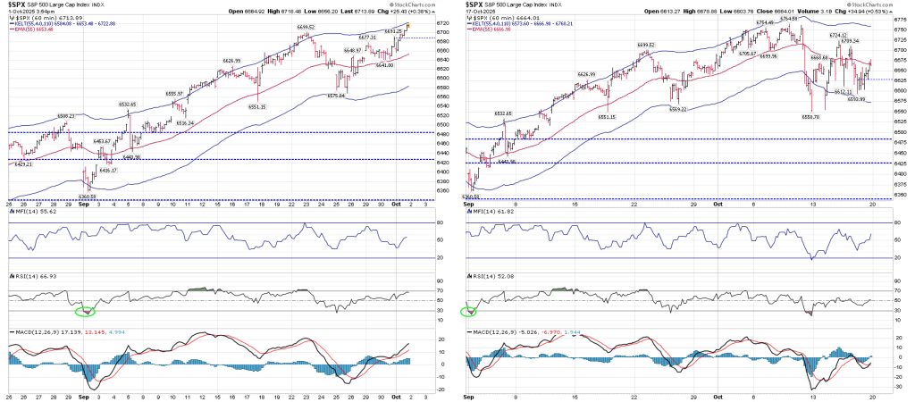 With the end of the “Unnatural T” on Monday, I am watching for what could result in an end of strength. That being said, I have a very tight leash on this position should we move above 6725. The present hourly chart shows a neutral RSI, but MACD has just crossed positive.